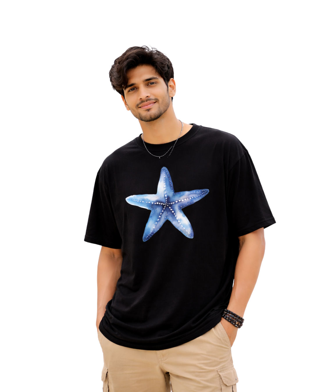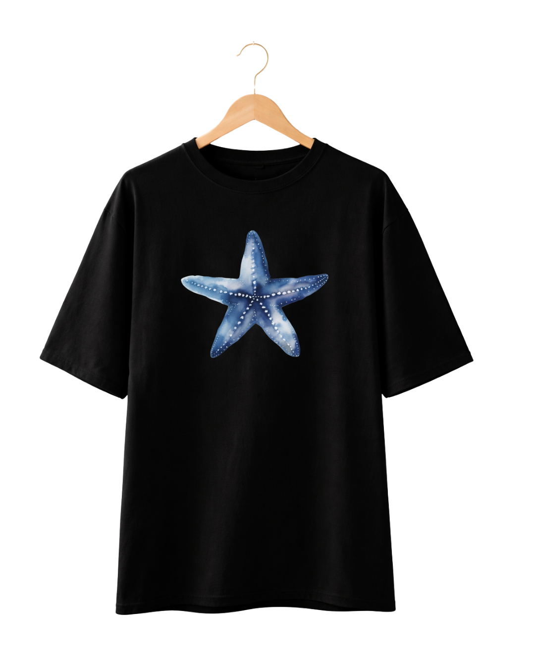 Inspired by the bioluminescent beauty of the deep sea, the Azure Starfish Tee features a stunning hand-painted watercolor graphic. The intricate blue and white detailing creates a luminous effect that pops vividly against the deep black backdrop. This is more than a t-shirt; it’s a wearable piece of art designed for those who appreciate nature-inspired aesthetics with a modern, urban edge.
