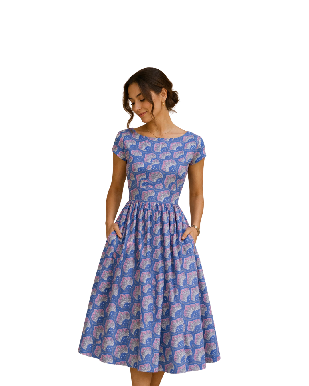 Experience a blend of timeless femininity and artisanal charm. This dress features a captivating repeating lotus-inspired motif in a rich Mediterranean blue, accented with soft lavender and dusty rose highlights. The silhouette is a classic fit-and-flare, boasting a structured bodice with a modest boat neckline that transitions into a beautifully pleated, full-circle skirt.